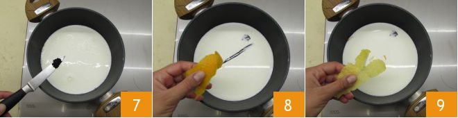 In the meantime, take care of the filling: in a saucepan pour the milk, flavor with the seeds from the vanilla pod and the pod itself 7, the orange zest 8, and the lemon zest 9.