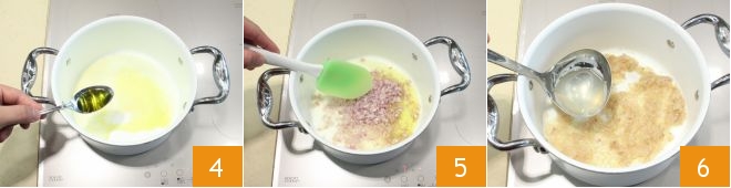 Prepare the risotto: peel the shallot and chop it finely, pour the oil into a large saucepan 4 and heat it, then add the chopped shallot 5 and let it soften for 10 minutes on low heat; add a ladle of hot broth 6.