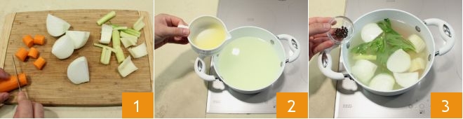 To make the rice croquettes with tuna and lemon, start by preparing the broth: wash, peel, and chop the celery, carrot, and onion 1, place the water in a large pot, add 100 ml of lemon juice 2, black pepper 3, and the vegetables. Bring everything to a boil, then add the salt. Cover with a lid and cook for about an hour and a half. Once cooked, adjust the salt and strain the broth with a sieve.