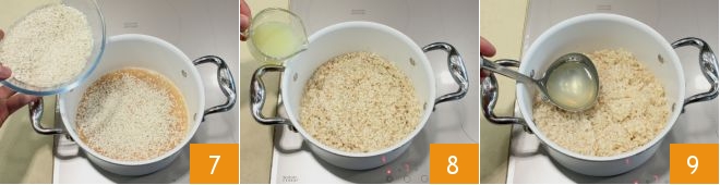 Add the rice 7 and toast it for a few moments, stirring; then deglaze with 100 ml of lemon juice 8 and continue cooking. Gradually add the lemon broth 9 as the rice absorbs the liquids (this will take about 20 minutes).