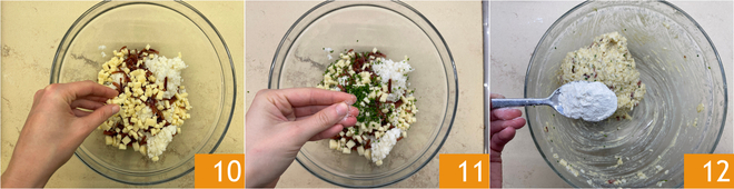 Season with a pinch of salt 10, chives, and pepper 11. Mix, then add the flour (you can adjust with the consistency by adding a little at a time to see if the entire indicated amount is needed) 12.