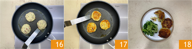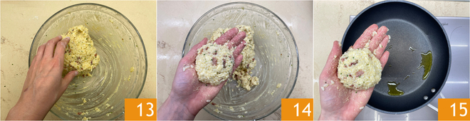 Knead until the mixture is compact 13. Form patties of about 3 oz each 14 and brown them in a non-stick pan with a drizzle of oil over medium heat 15.