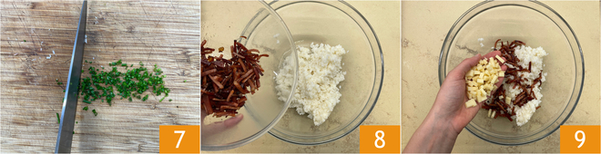 Finely chop the chives 7. Now it's time to knead: in a bowl, combine the rice, speck 8, cheese 9, and eggs.