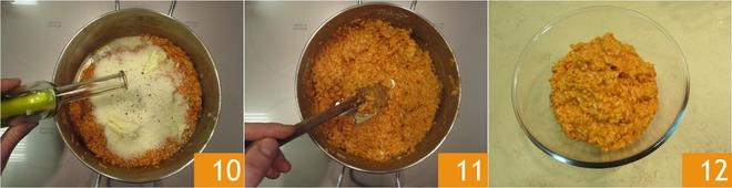 When cooking is finished, the rice should be dry 7, let it rest for two minutes. After resting, start the creaming: add parmesan, the butter 8, adjust salt 9 and pepper