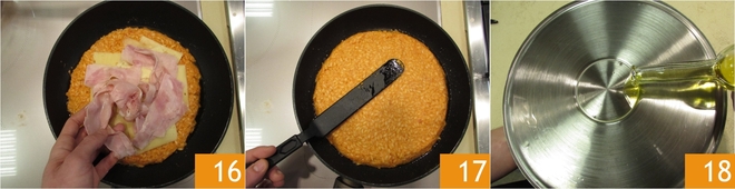 Now in a non-stick pan with a base diameter of 8.5 inches and a surface diameter of 11 inches, pour a drizzle of oil 13 and start putting about half of the rice in the pan, spread it with the help of a spatula so that it is well distributed on the bottom of the pan 14. Now place the fontina in the center of the rice 15