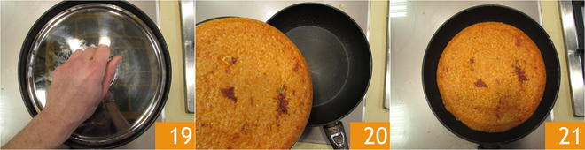 Place the lid 19 and flip the flan to the other side 20 and cook another 7 minutes. When it becomes slightly colored and a little crispy, it will be ready to enjoy 21.