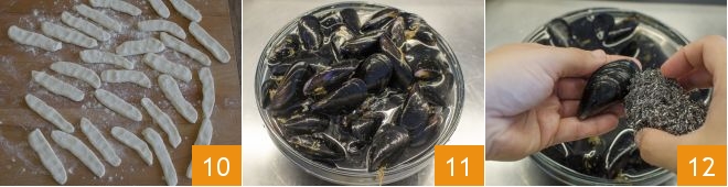 Let the gnocchi rest on the pastry board for about half an hour or until cooking time 10, covered with a cloth. Meanwhile, prepare the seasoning. Clean the mussels. Put them in a bowl and rinse under running water 11. Remove the beard with a firm tug. Clean the mussel shells, one by one, with a small knife or a steel wool pad 12. Rinse the mussels again under water.