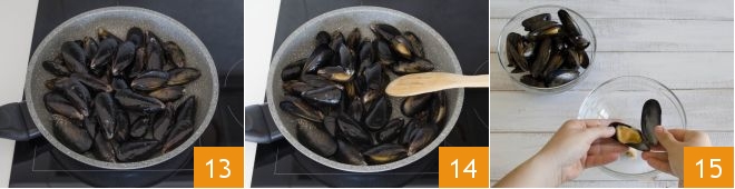 Heat a pan, add the mussels 13 and cover with a lid. After a few minutes, they will open 14. At this point, open the mussels one by one, removing the seafood and set aside 15. Keep a few whole for garnishing the dish.