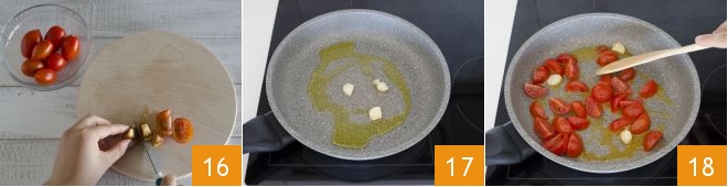 Wash the cherry tomatoes and cut them into quarters or pieces 16. In a non-stick pan, sauté the chopped garlic with a bit of olive oil 17. Add the cherry tomatoes 18 and cook until they are soft.