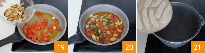 Salt and finally add the mussels 19, sauté for a few moments, and then flavor with chopped parsley 20. Cook the rice gnocchi in abundant salted water for about 12 minutes 21.