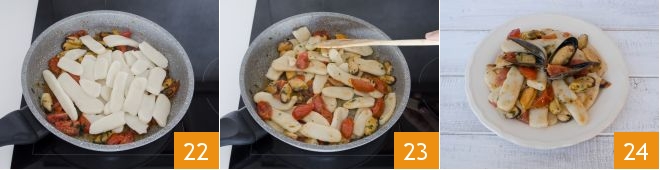 Drain and add the gnocchi to the seasoning in the pan 22. Sauté for a few minutes to mix all the ingredients 23 and then serve the rice gnocchi with mussels and cherry tomatoes hot 34.