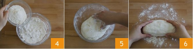 Add the all-purpose flour 4. Knead until you get a soft and non-sticky dough 5. If needed, add more all-purpose flour until fully absorbed. Dust the pastry board with flour, place the dough on it 6;