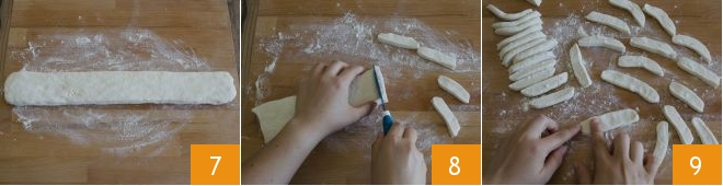 and form a rectangle, about 3/5 inch thick and 2 3/4 - 3 1/8 inches wide 7. With a sharp knife, cut it into slices about 1/5 inch thick 8. With your fingertips, make slight pressures to give the classic elongated shape of rice gnocchi 9.