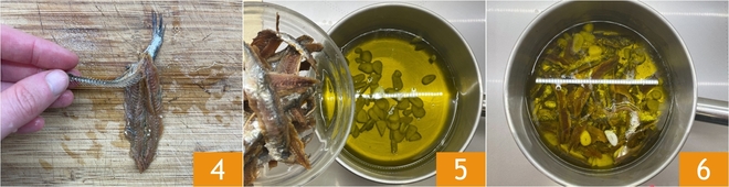 After the soaking time, open the anchovies in half and remove the bone and tail 4. Add the anchovies to the saucepan 5 and cook for about an hour over very low heat; the oil should not fry 6. In the meantime, prepare the vegetable broth that you will use to cook the rice.