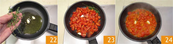 In a pan, heat a drizzle of oil with garlic and thyme 22. Pour in the tomatoes 23, salt, and cook for about 8-10 minutes on medium heat 34.