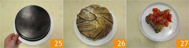 Once the timbale is cold, turn it upside down on a serving plate and remove the mold 25 26. Once cut into slices, serve it with the cherry tomatoes 27.