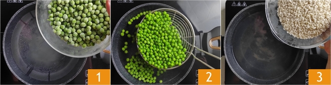 To prepare the rice timbale, first boil the frozen peas in plenty of salted water for a few minutes 1, they should remain al dente as they will continue cooking in the oven. Then drain them 2 and transfer them into a bowl to cool down. In the same cooking water of the peas, cook the rice al dente 3.