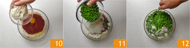40g of grated cheese, taken from the total amount 10, and the peas 11. Then mix the mixture with a spoon to combine all the ingredients 12.