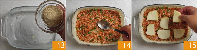 Butter a baking dish measuring approximately 10.5x6.5 inches and evenly sprinkle it with breadcrumbs 13, making sure to remove the excess. Then place a layer of seasoned rice at the bottom of the dish 14, pressing it with the back of a spoon. Add slices of smoked scamorza cheese 15.