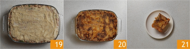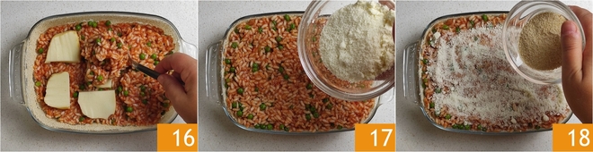 Then add another layer of rice 16, more slices of scamorza cheese, and a final layer of rice. Sprinkle the remaining grated cheese on the surface 17 and more breadcrumbs 18.