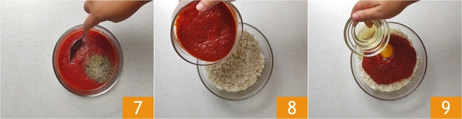 Mix 7. When the rice is ready, drain it into a bowl, let it cool, and then add the tomato sauce 8. Add the egg and egg white 9.