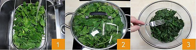 To prepare rich spinach with béchamel, start by cleaning and washing the spinach 1 (or get fresh spinach already washed, bagged, and ready to cook). After washing the spinach, boil them over medium heat (for about 5-6 minutes) with the water that the spinach retained during washing, covering the pot with a lid 2. Once cooked, squeeze them well to remove excess water 3.