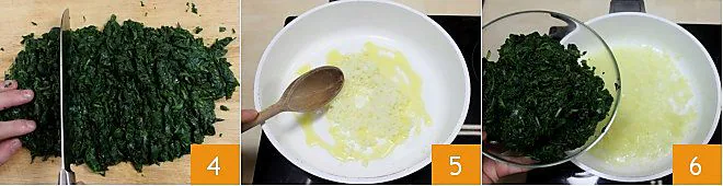 Roughly chop the spinach 4. Sauté the chopped onion over very low heat with two tablespoons of extra virgin olive oil 5, and as soon as the onion becomes transparent (it will take at least 10 minutes), add the spinach and sauté them for a few seconds over low heat 6.