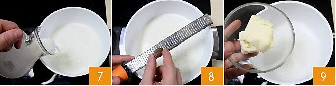 Meanwhile, prepare the béchamel (for more details, see the Béchamel sauce recipe). Start by heating the milk (without boiling it) 7 and add a pinch of salt and nutmeg 8. In another pot, melt the butter 9