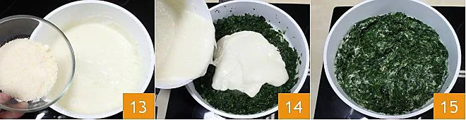 add the grated Grana Padano cheese, give a final stir, and remove the mixture from the heat 13. Add the béchamel to the spinach, mix everything well, and adjust the salt 14. Your rich spinach with béchamel is ready, serve it hot 15.