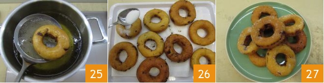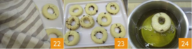 covered with a cloth 22 and continue to let them rise for half an hour. After the rising time, your small donuts are ready for cooking 23. Heat the seed oil, and when it reaches 340°F, immerse one donut at a time 34 to avoid lowering the oil's temperature (we recommend using a food thermometer to monitor the oil temperature).