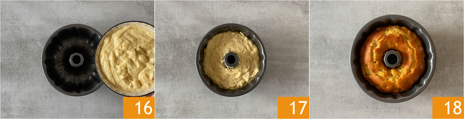 Pour the batter into a greased and floured bundt mold 16 17. Bake in a preheated static oven at 350°F for 45 minutes, performing the toothpick test to check for doneness. Remove from the oven 18, let it cool, then remove from the mold and let it cool completely before dusting with powdered sugar as desired!