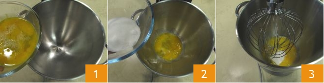 To prepare the ricotta and pear cake, start by melting 5 tbsp of butter over very low heat and then let it cool. Meanwhile, pour the eggs into a stand mixer with whisk attachment 1, add the sugar 2, 1/3 of the vanilla pod seeds, and start whisking at moderate speed 3; whisk for about 10 minutes.