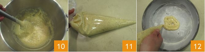 Mix from bottom to top to incorporate it 10, then put the obtained batter into a piping bag with a plain nozzle 11. Preheat the oven to 400°F in static mode. Butter and flour two 9-inch diameter pans, then create a layer of batter on the bottom, starting from the center with a spiral motion 12