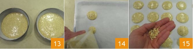 and gradually spreading over the entire surface: this way, you will get two perfect bases 13. At this point, with the remaining batter, you can make cookies that will be used for the final decoration of the cake: place a sheet of parchment paper on a baking tray, then start forming small disks with the leftover batter, spacing them a few inches apart, so they don't stick together while baking 14. You will get about twenty. Sprinkle them with chopped hazelnuts 15.