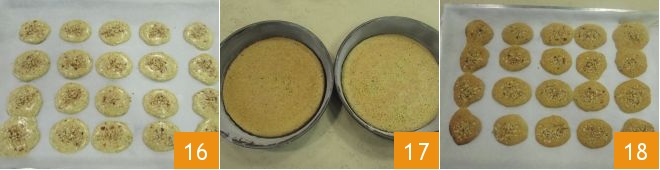 Now you also have the cookies ready 16. The bases should bake in a preheated static oven at 400°F for 13 minutes; the cookies for only 6 minutes. Once ready (17-18), let them rest to cool completely.