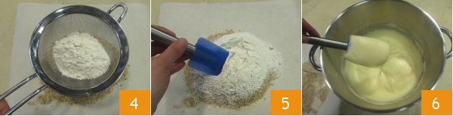 On a sheet of parchment paper, transfer the Giffoni hazelnut flour, sift the all-purpose flour on top 4, and mix with a spatula to combine them 5. Once you have obtained a well-whipped, light, and frothy mixture of eggs and sugar 6,