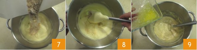 pour the dry ingredients in two parts 7, mixing with the spatula from top to bottom to combine them without deflating the mixture 8, then slowly add the melted butter brought to room temperature 9.