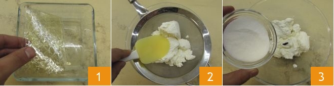 Place the gelatin sheets in a bowl with cold water 1. Meanwhile, take the buffalo and cow's milk ricotta left to drain from the whey (even overnight if necessary), pass them through a sieve 2, then add the vanilla seeds you set aside earlier and 80 g of sugar 3.