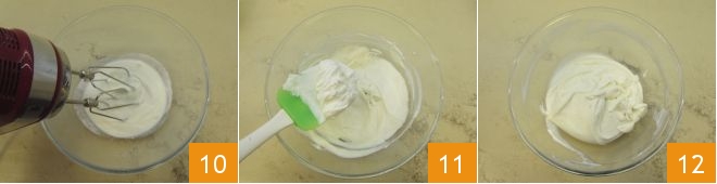 Whip the cream and sugar with perfectly clean electric mixer whisks 10. Then add the cream to the ricotta cream, first with a spatula mixing energetically 11, then the rest, mixing gently from top to bottom not to deflate the cream. You will obtain your smooth and velvety cream 12. You can put it in a disposable piping bag with a plain nozzle.