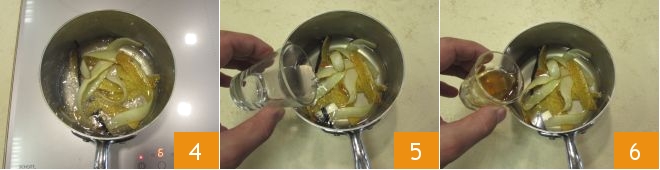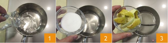 Pour the water into a small saucepan 1 along with the sugar 2, the vanilla pod without seeds (which you will set aside), and the pear peels 3.