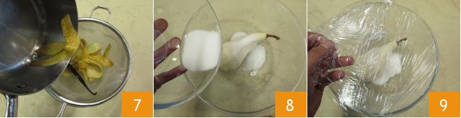 Mix, then you can strain 7, so you will have the syrup ready to soak the cake bases. In a bowl, place a whole peeled pear (leaving the stem) and cover it with sugar 8, rotate the bowl so the sugar is distributed over the pear. Then cover with plastic wrap 9 and place in the fridge for at least 1 hour. Then microwave it for 4 minutes at maximum power.