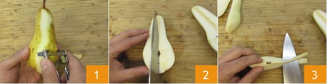 Wash and peel the pears with a vegetable peeler (keep the peels aside for they will be used later) 1; cut the pears in half 2, remove the core 3