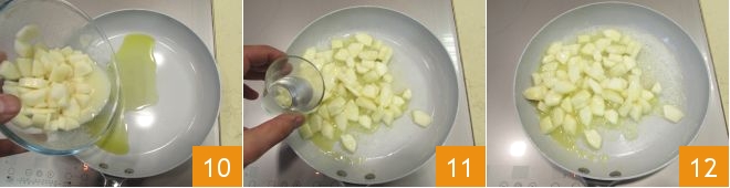 In a large pan, pour a drizzle of extra virgin olive oil and let it heat; add the pear cubes 10 and stir. Cook for a few minutes, then add a little water and flavor with the seeds of 1/3 vanilla pod; cook for a few more moments, stirring occasionally, and deglaze with the pear distillate 11. The pears should remain crunchy. Pour the cooked pears, still warm, into a bowl, recovering the juice well, and cover with plastic wrap. Let cool and meanwhile prepare the pear syrup.