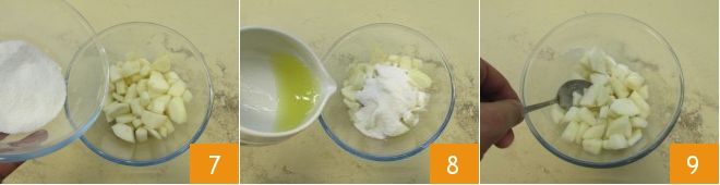 and dice them 4. Place the pear cubes in a bowl; in another, pour the sugar 5 and the starch 6, mix them together