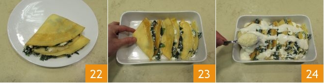 Then fold the half-moon in half again to create a small fan shape 22. As you fill them, arrange the folded ricotta and spinach crepes in a slightly greased baking dish 23. Sprinkle the crepes with béchamel and grated cheese 34;