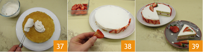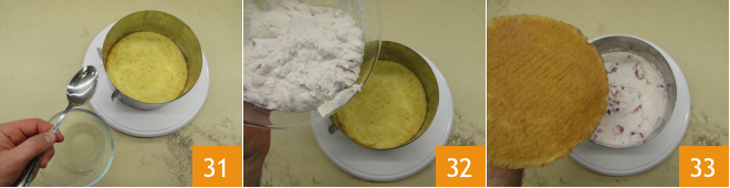 Moisten with a bit of syrup 31, pour the cream with the strawberry pieces 32, and then place the other disk 33.