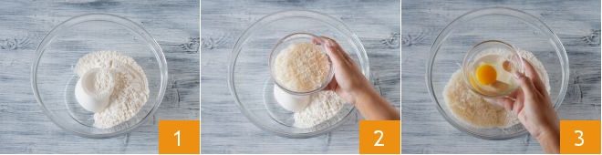 To prepare ricotta gnocchi with pepper cream and sausage, place the ricotta, the flour 1, the Grana Padano PDO 2, and the egg 3 in a large bowl.