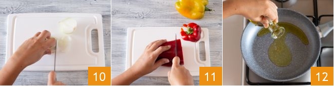 Take care of the seasoning: clean and slice the onion 10; dice the red and yellow peppers by first cutting off the top and removing the inner filaments and seeds 11. Pour the oil 12 into a pan and heat it slightly