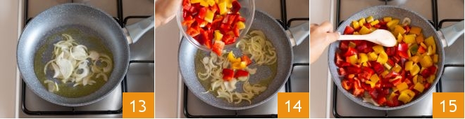 saute the onion for a couple of minutes in the pan while stirring 13. Then add the peppers to the onion 14, adjust the salt, and cook for about 15 minutes, stirring occasionally 15; during cooking, pour in a ladle of hot water. Then remove from heat and let it cool slightly.