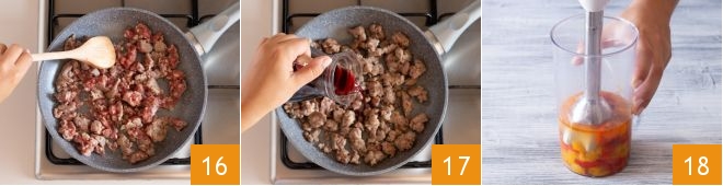 Meanwhile, focus on the sausage: remove the casing, crumble it and cook it in the pan for about 10 minutes, stirring often 16. Deglaze with the wine 17 and let it evaporate completely. When the peppers have cooled slightly, blend them with an immersion blender 18